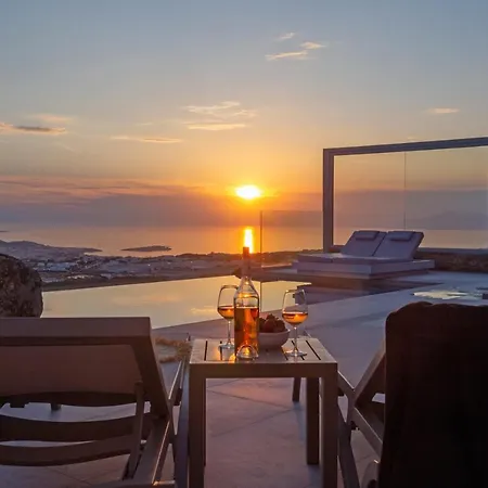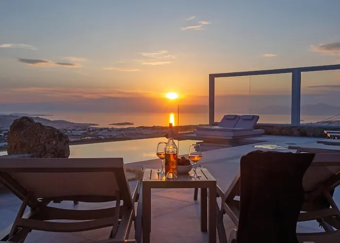 Die Mykonian Tramonti Villas Plintri liegt ungefähr 10 Minuten Autofahrt vom Strand von Ftelia entfernt und bietet einen Esstisch, einen Swimmingpool und Essbereiche im Freien auf einer Terrasse für einen angenehmen Aufenthalt.